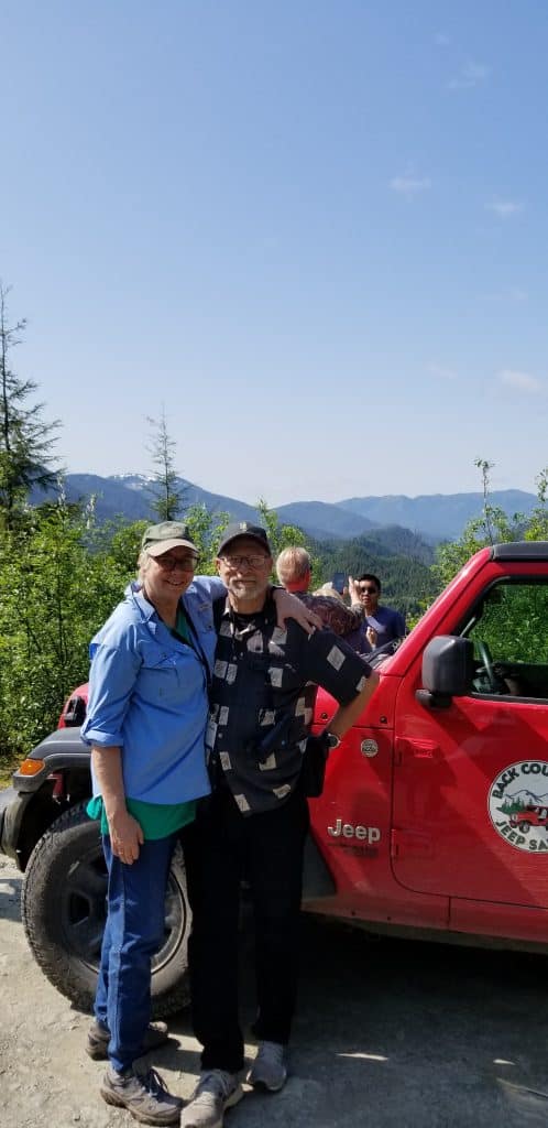 More or less dockside, waiting on us were a line of Jeeps. Four Wheelers. We got a red one with a couple of newly-weds (From Warren Michigan) in the back seat. Dropping into 4-wheel drive/low we banged around a couple of old logging roads. We were linked with two-way radios and managed not to fall off the road. [We saw an abandoned SUV way down a slope.] The “ride” was rocky and bumpy enough that my smart watch actually recorded that I had walked three miles. Photo ops high up with a distant view of the Pacific Ocean and then back to the docks to find our bus waiting.
